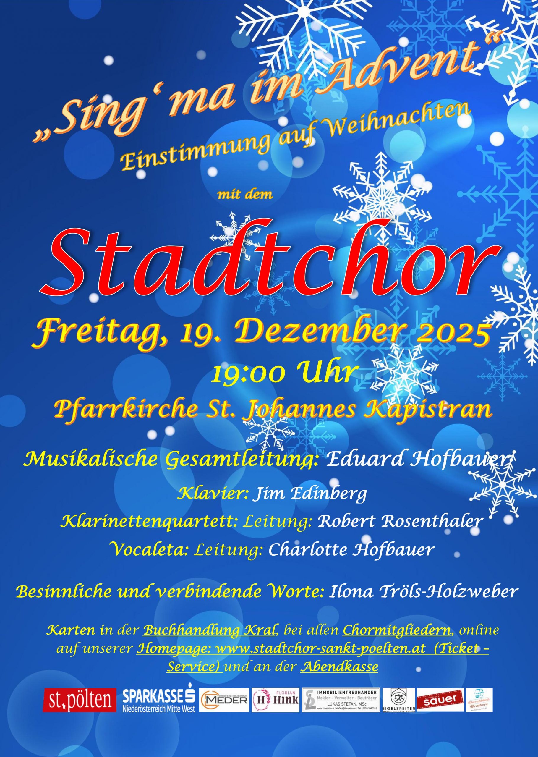 Am 19. Dezember 2025 lädt der Stadtchor St. Pölten wieder zu seinem traditionellen Adventkonzert in die Pfarrkirche St. Johannes Kapistran in der Josefstraße ein. Unter der Leitung von Eduard Hofbauer wollen die Sängerinnen und Sänger das Publikum auf das bevorstehende Weihnachtsfest einstimmen. Es wartet ein vielfältiges Programm auf die Gäste, so werden besinnliche Volksweisen, beschwingte Lieder zur Weihnachtszeit und auch traditionelle Adventlieder dargeboten. Stimmungsvoll wird auch das choreigene Vokalensemble Vocaleta unter der Leitung von Charlotte Hofbauer beim Konzert mitwirken. „Mit unseren Liedern und Texten wollen wir die Menschen auf Weihnachten einstimmen. Hektik und Stress bestimmen oft den Alltag, die Vorweihnachtszeit soll jedem die Möglichkeit geben, sich auf das Wesentliche zu besinnen, zur Ruhe zu kommen und ein friedvolles und harmonisches Miteinander zu leben!“, betont Chorleiter Eduard Hofbauer. Durch das Programm führt Ilona Tröls-Holzweber mit Gedichten und Geschichten. Bereichert wird das Konzert durch das Klarinettenquartett unter der Leitung von Robert Rosenthaler. Am Klavier begleitet heuer erstmals Jim Edinberg. Einlass: 18:15 Uhr, Beginn: 19.00 Uhr. Karten sind ab 3. November in der Buchhandlung Kral (ehem. Schubert), bei den Chormitgliedern und auch an der Abendkasse erhältlich. Kartenreservierungen können auch auf der Homepage unter www.stadtchor-sankt-poelten.at (Ticket Service) vorgenommen werden. Der Kartenpreis beträgt 18€ / Erwachsene und 9 € für Schüler